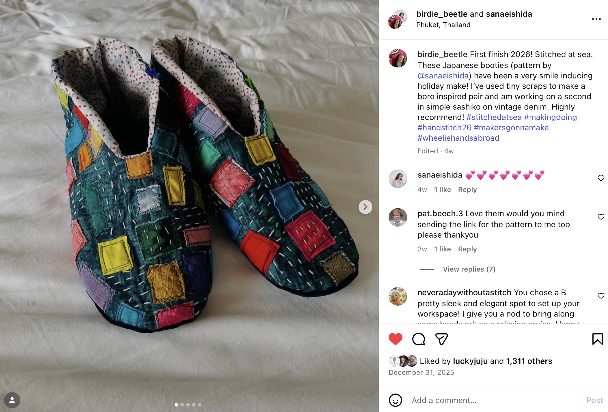 Alright 2026, watcha got? I’m a little sniffly, but with my body layered up in my jumpsuit and other handmade garments, my neck hugged by a haramaki cowl, and my feet swaddled by winter booties, I’m ready.